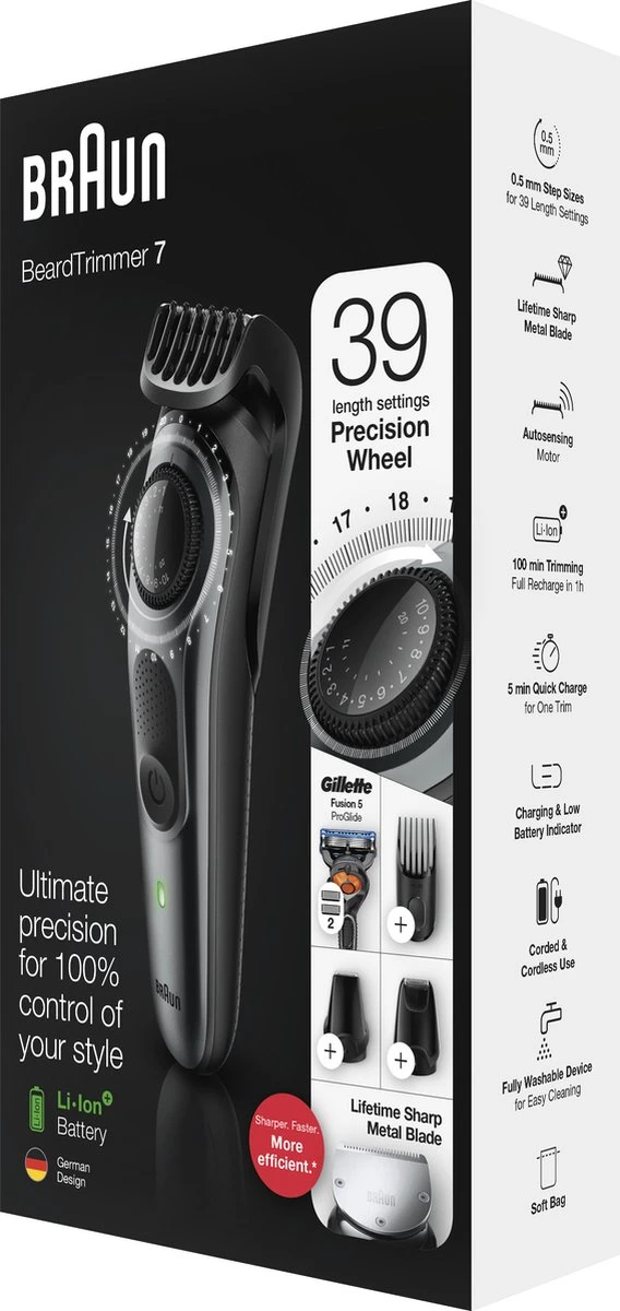 Creëer moeiteloos je stijl met de Braun BT7220 baard- en haartrimmer voor mannen. De BT7220 heeft een nauwkeurige precisiedraaiknop met 39 lengte-instellingen en heeft levenslang scherpe mesjes en een Li-ionbatterij. Wasbare trimkop en kam.