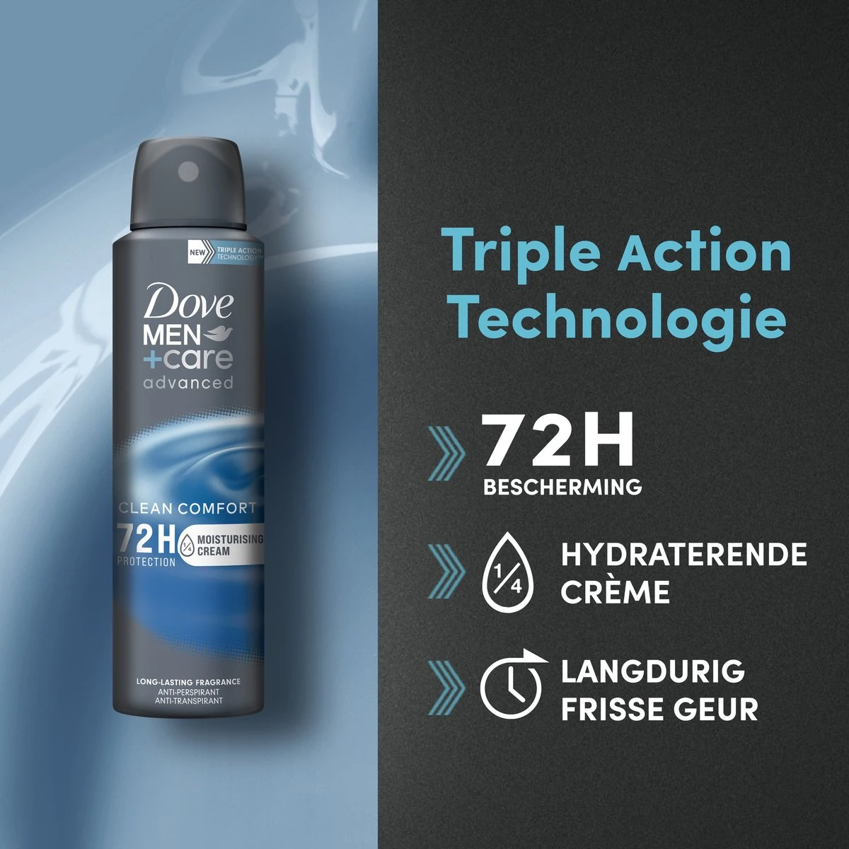 De Dove Men+Care Advanced Clean Comfort Anti-Transpirant Deodorant Spray beschermt 72 uur lang tegen zweet en geurtjes, heeft een langdurig frisse geur en verzorgt je oksels. Het bieden van bescherming komt op de eerste plaats bij deze anti-transpirant spray. Gemaakt met de revolutionaire Triple Action Technologie, is deze anti-transpirant ontworpen om je tot 72 uur lang tegen zweet en geur te beschermen. Met een frisse, mannelijke geur om je langdurig fris en zelfverzekerd te voelen. Deze Dove Men+Care anti-transpirant is verrijkt met onze unieke ¼ hydraterende crème, die je okselhuid verzorgt. Irritaties door zweet en scheren behoren tot het verleden. Je krijgt een gehydrateerde en beschermde huid en gladde, comfortabel aanvoelende oksels.