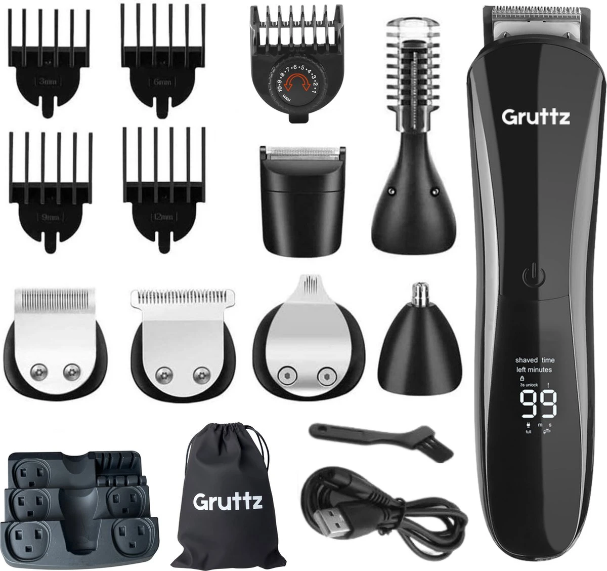 All in 1 – met 11 opzetstukken kan jij jouw opties niet op; Baardtrimmer, Precisietrimmer, T-Bladetrimmer, Detailtrimmer, Neus- & oortrimmer en Lichaamshaartrimmer. Daarnaast heb je alle opzetstukken om alle lengtes te pakken die jij nodig acht. Oh, en dan vergeten we bijna nog onze travelbag. Hiermee kan je dus alles veilig bij elkaar opslaan als je op reis gaat!
