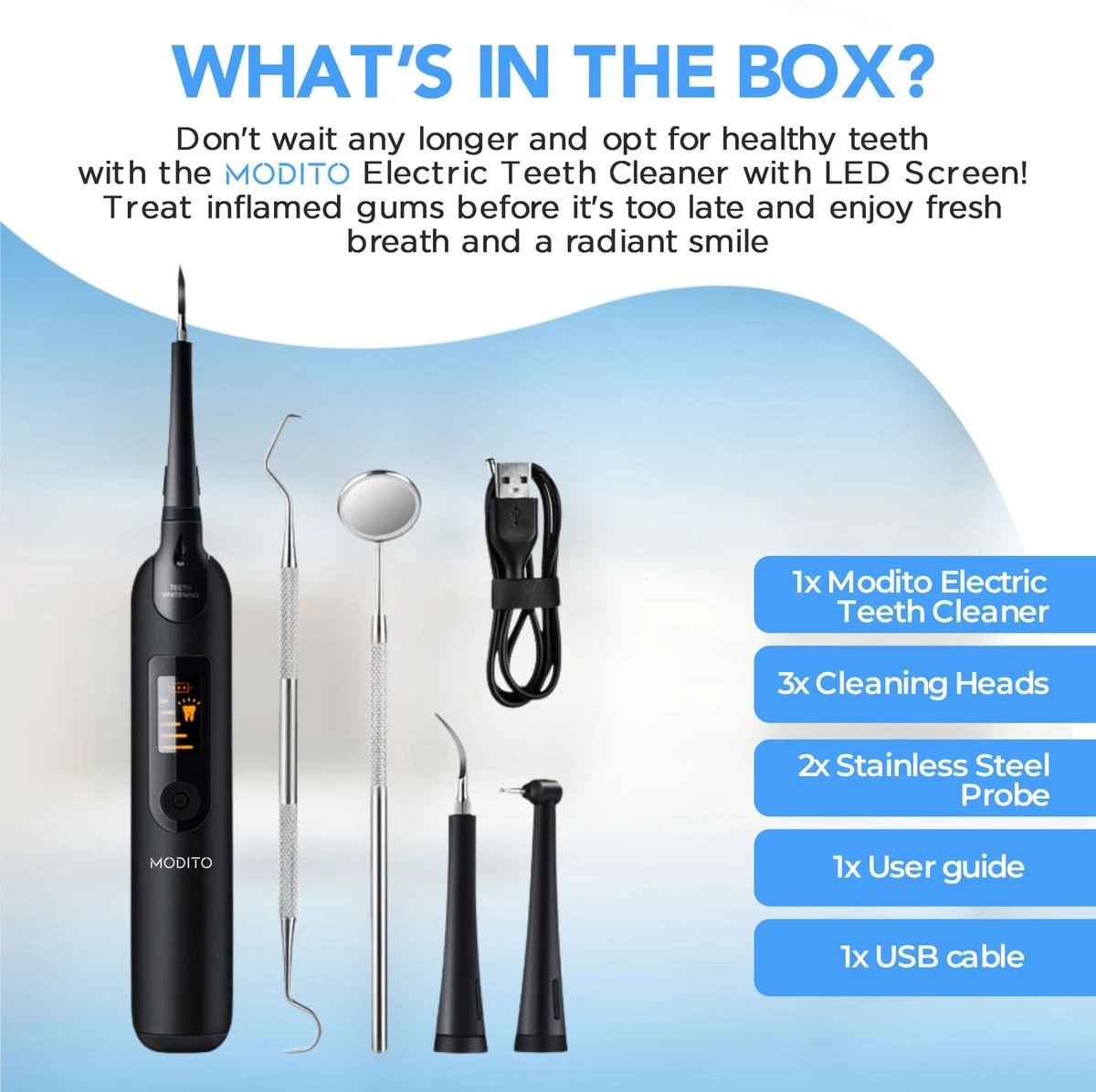 We begrijpen dat het maken van afspraken bij de tandarts of mondhygiënist vervelend kan zijn, maar met onze professionele tandsteenverwijderaar kun je gemakkelijk en snel je gebit reinigen zonder hoge tandartskosten. Het apparaat is uitgerust met een ingebouwd LED-lampje en wordt geleverd met drie opzetstukken en een tandartset voor optimaal gebruiksgemak.
