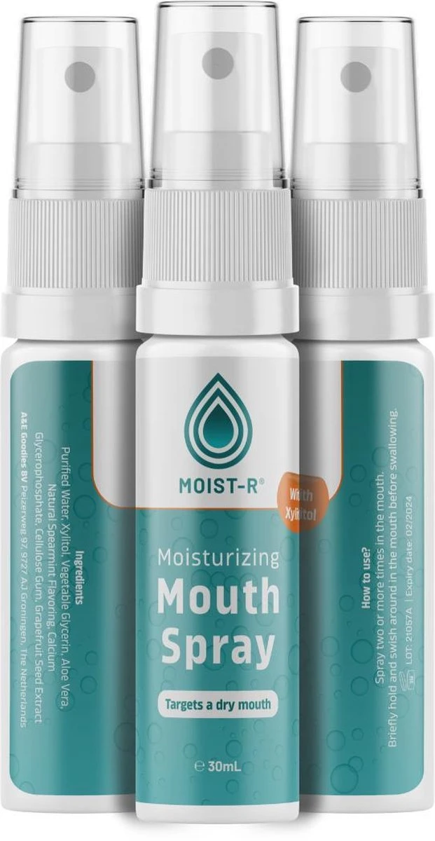 - Spray overdag en voor het slapen gaan met Moist-R Mondspray