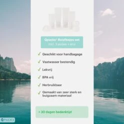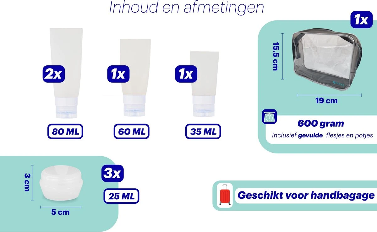 Qpacks – 8-delige Reisflesjes Set Transparant – Vliegtuig Handbagage – Navulbare Reis 100ML Flacons – Incl. Potjes & Etui -Travel – Reisaccessoires