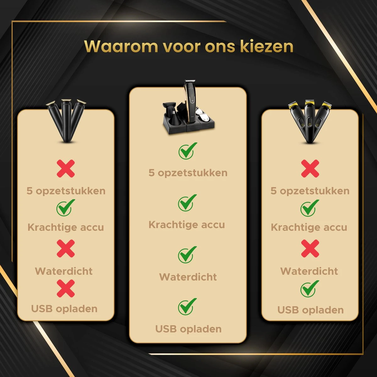 VEELZIJDIG – de haartrimmer is uitgerust met 5 hulpstukken. Inclusief neustrimmer en scheermesje, evenals 5 geleidekammen, oplaadkabel, standaard en smeerolie en reinigingsborstel.