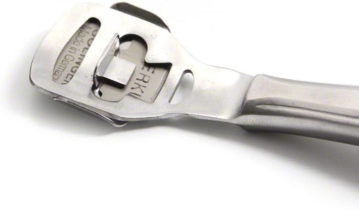 Verwijder eelt zacht en efficiënt met deze professionele, handmatige eeltverwijderaar. Deze eeltschraper is geheel vervaardigd uit RVS en voelt daarom zeer solide aan en is duurzaam in gebruik. De meshouser bevat tweezijdige mesjes om de eelt volledig en ultranauwkeurig te verwijderen.