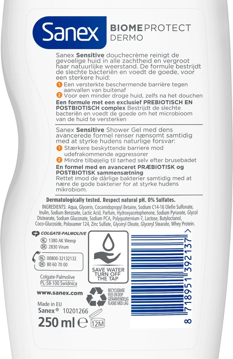 Zorg voor je gevoelige huid en houd haar gezond met Sanex BiomeProtect Dermo Sensitive douchegel. Deze bodywash is met zorg ontwikkeld om je gevoelige huid in alle zachtheid te reinigen en te kalmeren en haar natuurlijke weerstand te versterken. Onze bodywash biedt microbioom huidverzorging door de goede bacteriën op de huid te voeden en de slechte te bestrijden, waardoor je huid beter tegen aanvallen van buitenaf bestand is. De geavanceerde formule bestaat uit een unieke combinatie van voedende bestanddelen om het microbioom van je huid – je eerste natuurlijke beschermlaag – te versterken. Sanex BiomeProtect Dermo Sensitive douchegel bevat een exclusief prebiotisch en postbiotisch complex om de goede bacteriën op de huid te ondersteunen en de natuurlijke huidbarrière te hydrateren en versterken. Bovendien is het dermatologisch getest, het respecteert de natuurlijke pH van je huid en het bevat 0% sulfaat om je huid te helpen zich van haar beste kant te tonen.