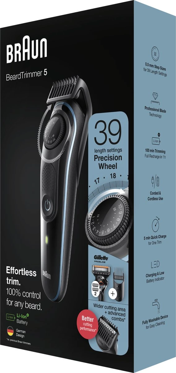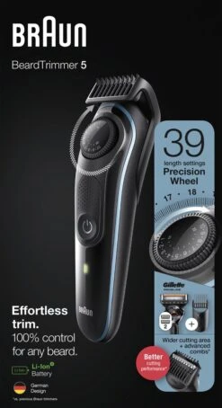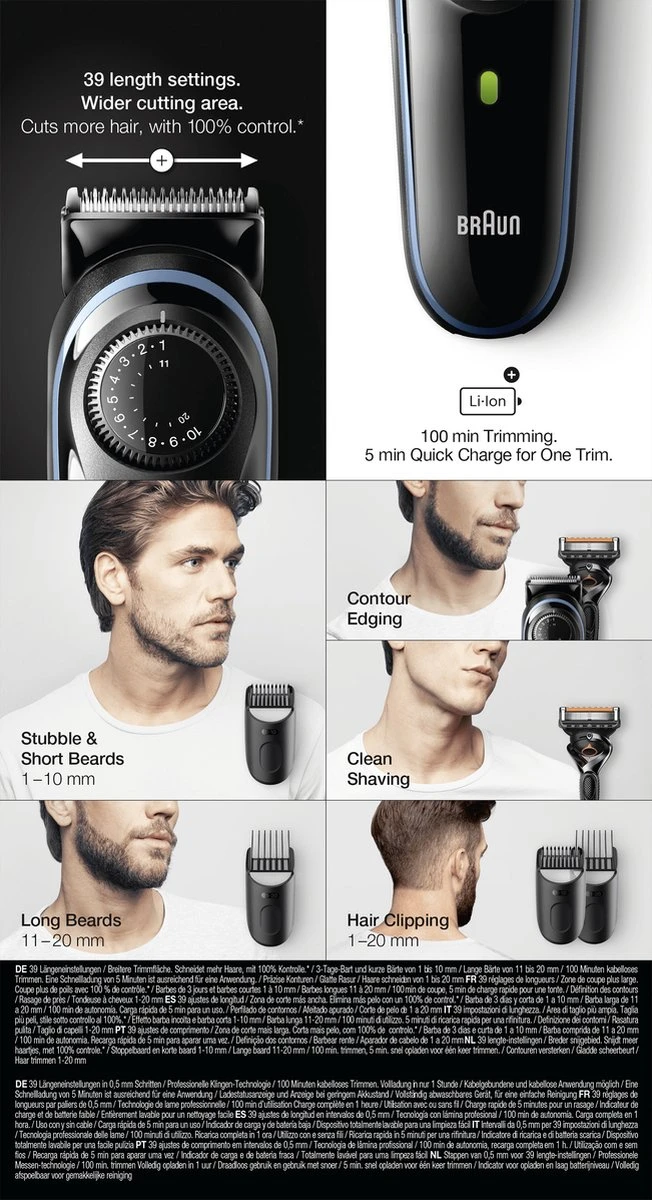 | Verpakkingsinhoud | 1x baardtrimmer1x trimopzetstuk voor details 1x precisie-baardkam (0,5-10 mm) 1x precisie-haarkam (10,5-20 mm) 1x kam voor baardvervaging 1x minischeerapparaat 1x reinigingsborsteltje 1x etui |