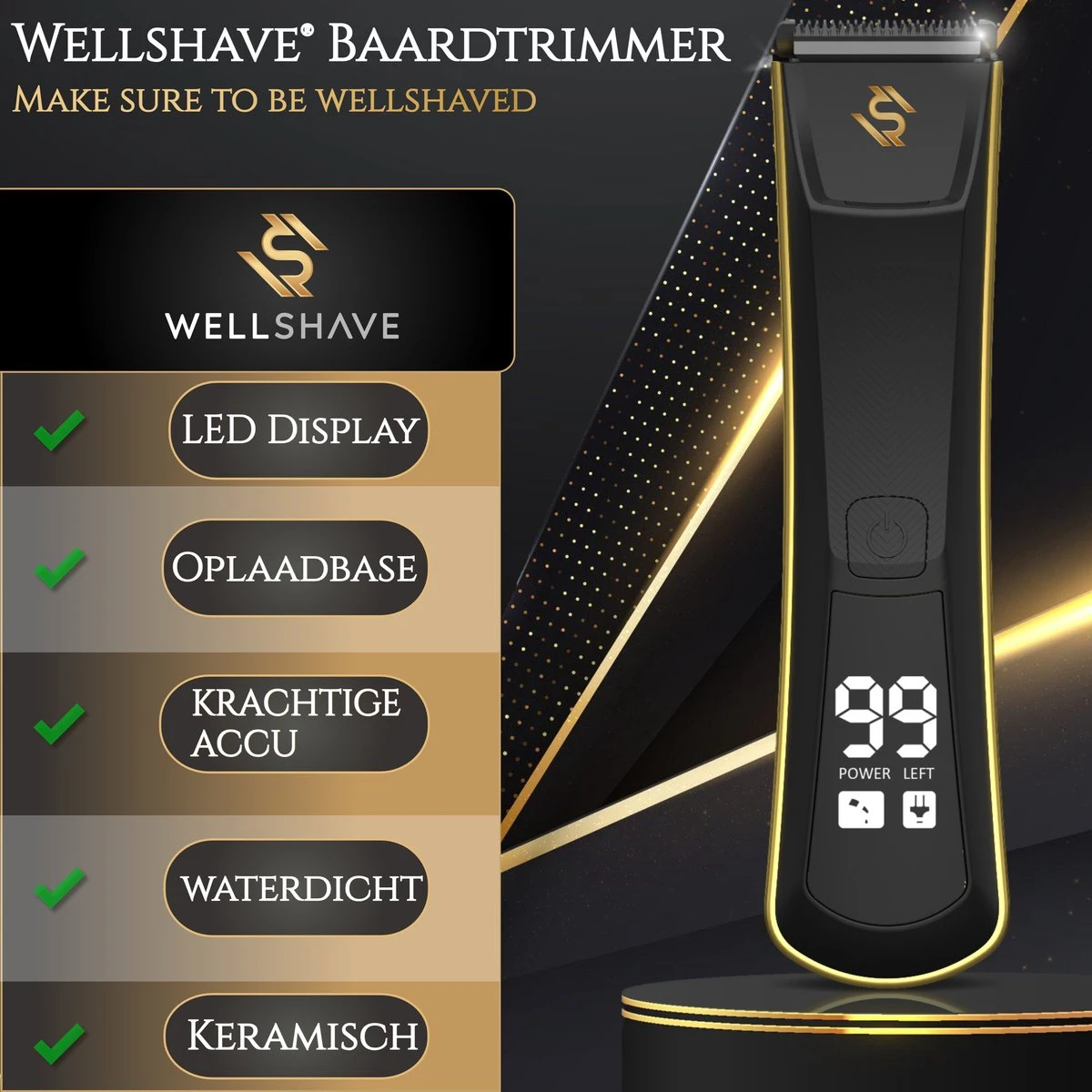 - De Wellshave Trimmer Luxe heeft een LED-scherm waarmee de batterijstatus exact afgelezen kan worden en welke modus actief is. Wanneer de trimmer opgeladen moet worden, kan deze draadloos opgeladen worden door deze op het oplaadstation te zetten. De trimmer kan ook direct opgeladen worden met een kabel. Dankzij de verstelbare opzetstukken zijn meerdere opzetstukken niet langer nodig. De opzetstukken kunnen eenvoudig verschoven worden voor de ideale haarlengte.